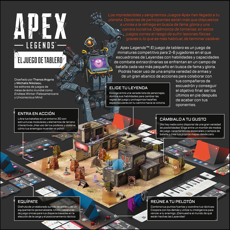 Apex Legends™: El juego de tablero es un juego de miniaturas competitivo para 2-6 jugadores en el que escuadrones de Leyendas con habilidades y capacidades de combate extraordinarias se enfrentan en un campo de batalla cada vez más pequeño en busca de fama y gloria.