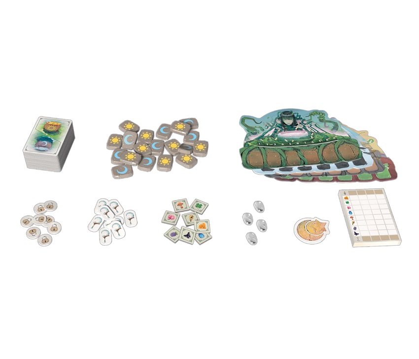 72 cartas, 22 runas, 25 fichas, 4 tableros, 4 contadores, 1 cuadernillo de puntuación, 1 reglamento