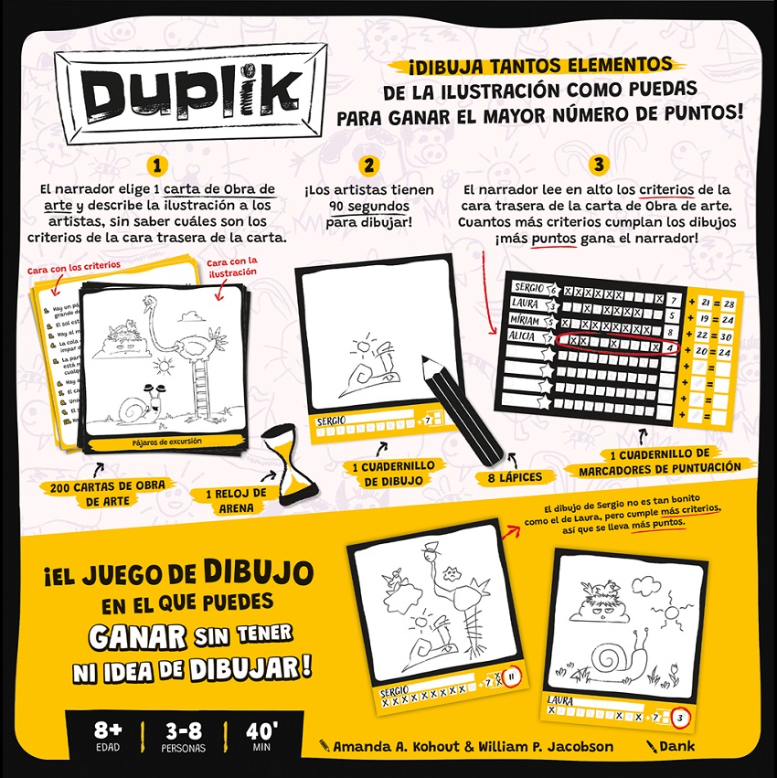 200 cartas de Obra de arte, 8 lápices, 1 cuadernillo de dibujo, 1 cuadernillo de marcadores de puntuación, 1 reloj de arena de 90 segundos