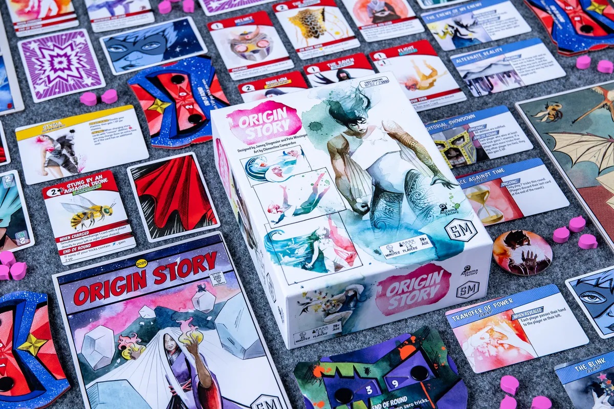 Historia de origen es un juego de bazas y construcción de motor que se juega a lo largo de 5 rondas. Cada ronda representa un capítulo de tu desarrollo y añadirás una nueva carta a tu tablero en cada una. Carga tus cartas y usa sus habilidades para obtener más puntos que tus oponentes.