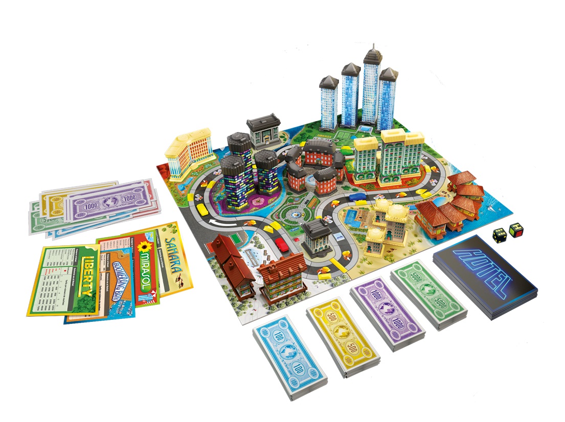 1 tablero, 30 Edificios, 8 Zonas de recreo, 30 Entradas, 8 Títulos de propiedad, 100 billetes, 4 Coches, 2 dados, 1 reglamento.