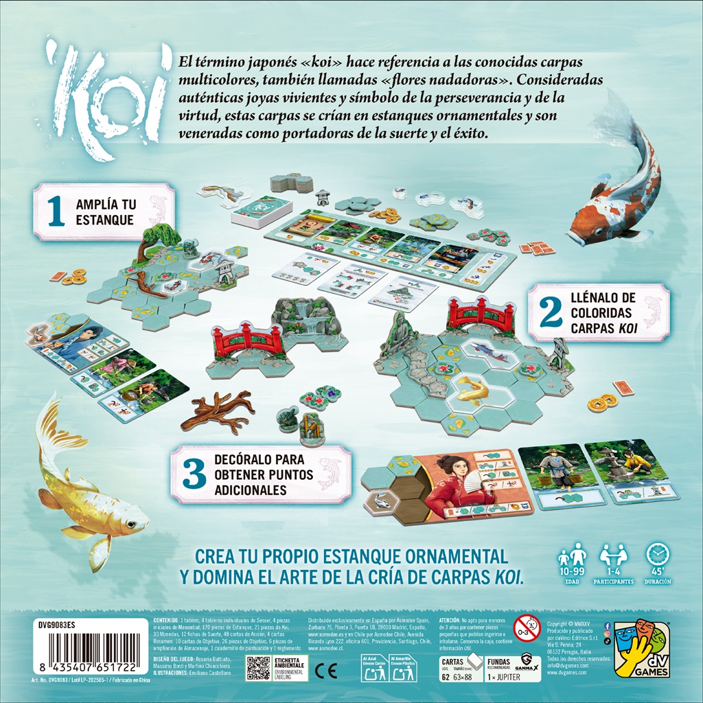 tablero, 4 tableros individuales de Sensei, 4 piezas iniciales de Manantial, 170 piezas de Estanque, 21 piezas de Koi, 30 Monedas, 12 fichas de Suerte, 48 cartas de Acción, 4 cartas Resumen, 10 cartas de Objetivo, 26 piezas de Objetivo, 6 piezas de ampliación de Almacenaje, 1 cuadernillo de puntuación y 1 reglamento
