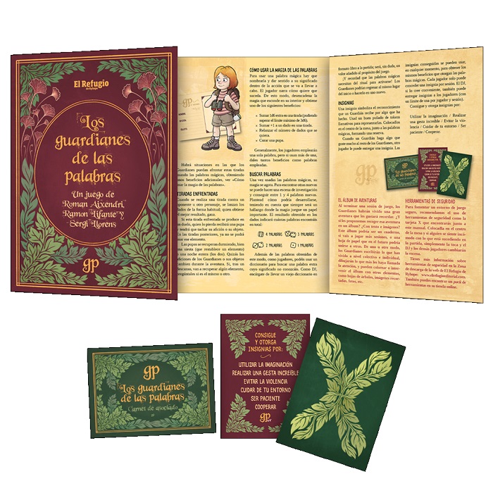 Cuadríptico 21 x 14,8 cm. Encuadernación: Plegado. A todo color. + 4 Carnets de asociados + 1 Tarjeta X y 1 Tarjeta de ayuda para el Director de juego y los Guardianes