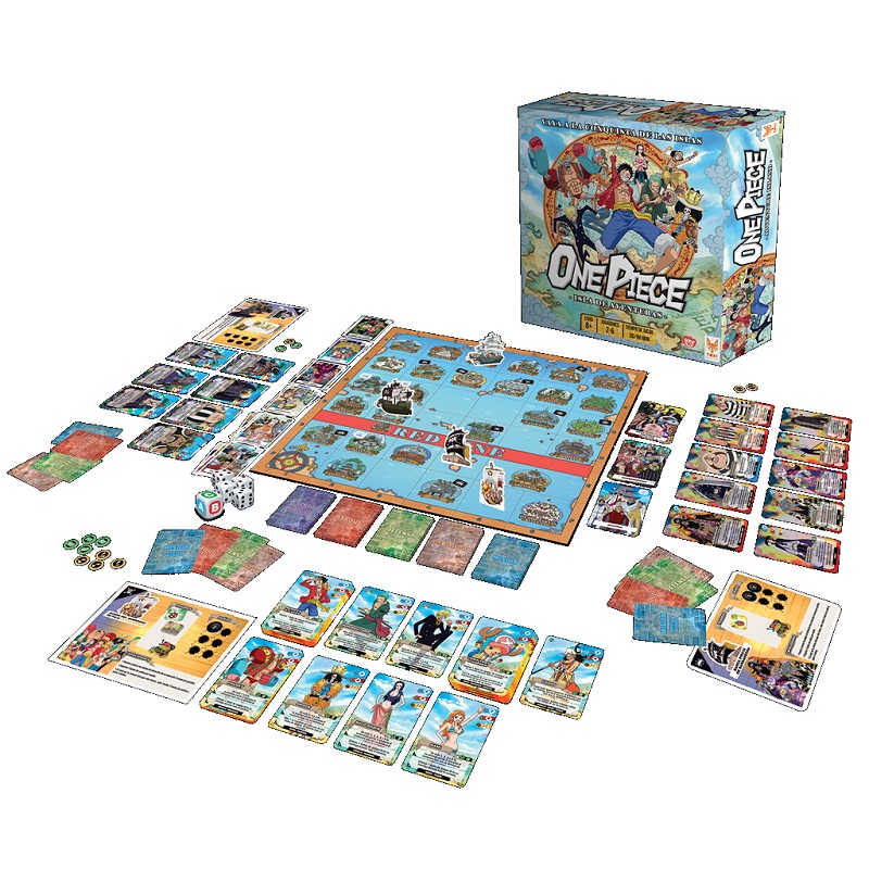 1 tablero de juego, 13 fichas de barco, 154 grandes cartas de personajes tripulados, 119 personajes de las islas, 50 cartas evento, 27 cartas log pose, 40 cartas ataque, 30 cartas de defensa, 30 cartas de debilidad, 26 cartas de misión, 80 fichas victoria, 20 fichas de cañón, 76 fichas de daño, 22 fichas log pose, 84 banderas, 28 fichas de las islas, 15 fichas de barcos y 8 dados