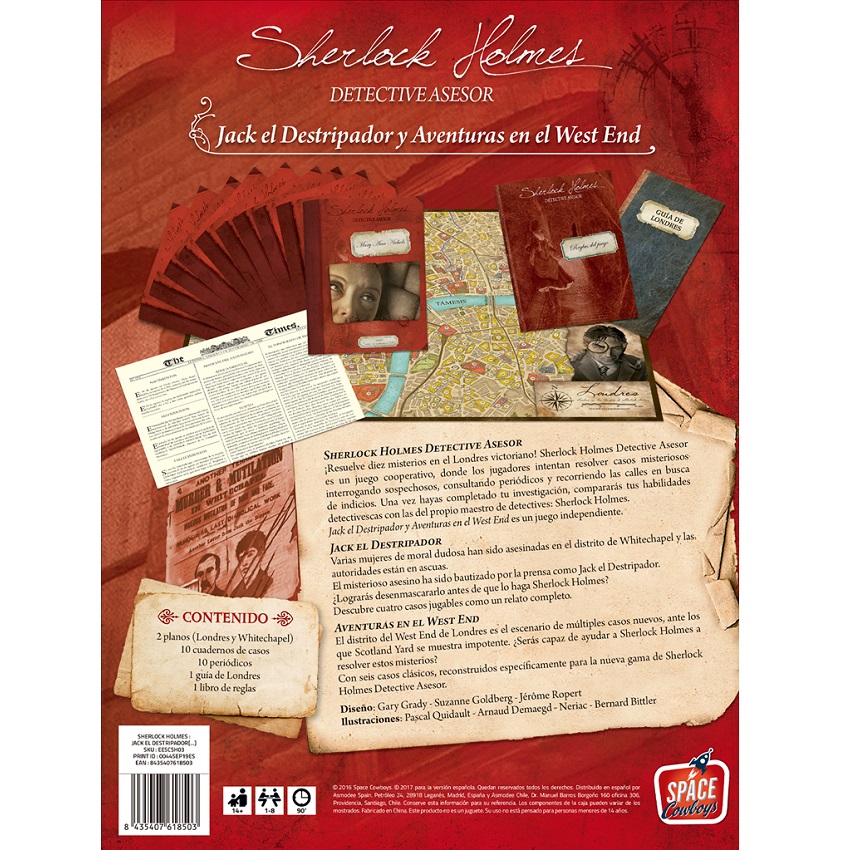 ¡Resuelve diez misterios en el Londres victoriano! Sherlock Holmes Detective Asesor es un juego cooperativo, donde los jugadores intentan resolver casos misteriosos interrogando sospechosos, consultando periódicos y recorriendo las calles en busca de indicios. Una vez hayas completado tu investigación, compararás tus habilidades detectivescas con las del propio maestro de detectives: Sherlock Holmes. Jack el Destripador y Aventuras en el West End es un juego independiente. Jack el Destripador Varias mujeres de moral dudosa han sido asesinadas en el distrito de Whitechapel y las autoridades están en ascuas. El misterioso asesino ha sido bautizado por la prensa como Jack el Destripador.