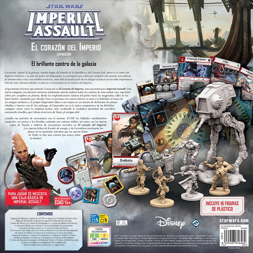 ¡Experimenta el temor que infunde Coruscant en El corazón del Imperio, una expansión para Imperial Assault! Una nueva campaña con dieciséis misiones totalmente nuevas explora todos los estratos de esta ciudad cuya superficie cubre por completo un planeta, desde los resplandecientes salones del poder hasta las mugrientas calles de los bajos fondos. Ayudados por Ahsoka Tano en persona, tres nuevos héroes se unen a la Rebelión en busca de un antiguo artefacto, y el propio Emperador lidera a sus tropas en un intento de desbaratar los planes rebeldes y hacerse con él. Sin embargo, el Emperador no es la única competencia de los Rebeldes: cualquier rostro entre la multitud podría estar ocultando la verdadera identidad del mortífero metamorfo clawdita, que trabaja al servicio de Maul, ¡el antiguo sith!