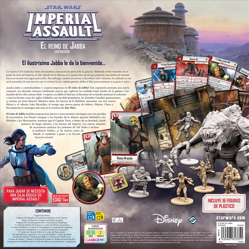 ¡Lucha junto a contrabandistas y cazarrecompensas en El reino de Jabba! Esta expansión presenta una nueva campaña con dieciséis misiones totalmente nuevas que exploran los sórdidos bajos fondos de la galaxia y los mundos de los viles señores Hutt. Coopera con Jabba el Hutt por el bienestar de tu familia mientras te enfrentas a nuevas fuerzas como los ágiles Soldados con mochila propulsora, los fornidos Guardias gamorreanos, ¡e incluso un feroz Rancor! Mientras tanto, las fuerzas de la Rebelión aumentan con tres nuevos Héroes y el valiente Luke Skywalker, al tiempo que nuevas piezas de tablero, Objetos, Clases y Recompensas te sumergen aún más en la aventura de Star Wars.